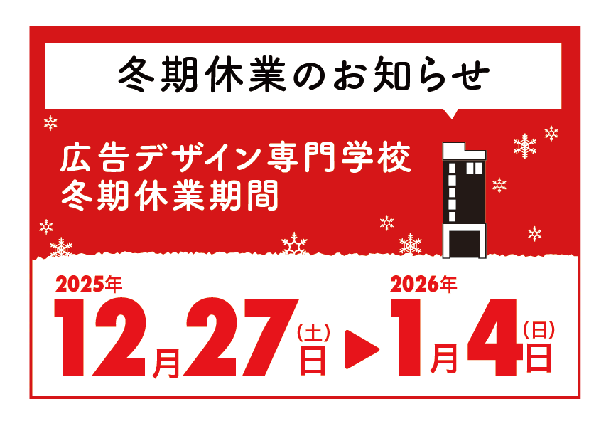 広告デザイン専門学校 事務局・総合受付では下記の期間を冬期休業とさせて頂きます。休業……