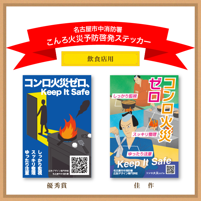 名古屋市中消防署さまより「中区は飲食店も多く、家庭も含めて火災原因の多くがこんろにまつわる火災であることから、防止ステッカーを配ることで注意喚起を促したい。そこで中区で学ぶ学生の皆さんの知恵とデザイン力をお貸しください。」とのご依頼いただき、「こんろ火災予防啓発ステッカー」のデザインを中区にある2校の専門学校の学生によるコンペ形式で取り組むことになりました。