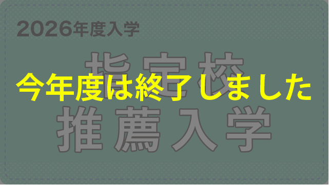 | 対象条件 | ●本校を専願であること ●高等学校卒業見込みの方 ●説明会・プレスクールへの両方参加、又は個別相談を受ける ●本校指定校であること(高校の先生に確認してください) ●出願時に「推薦書」を提出した方 |